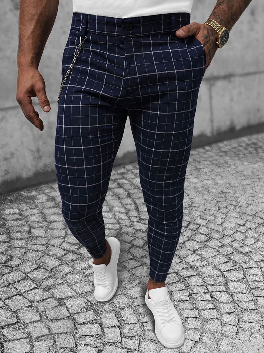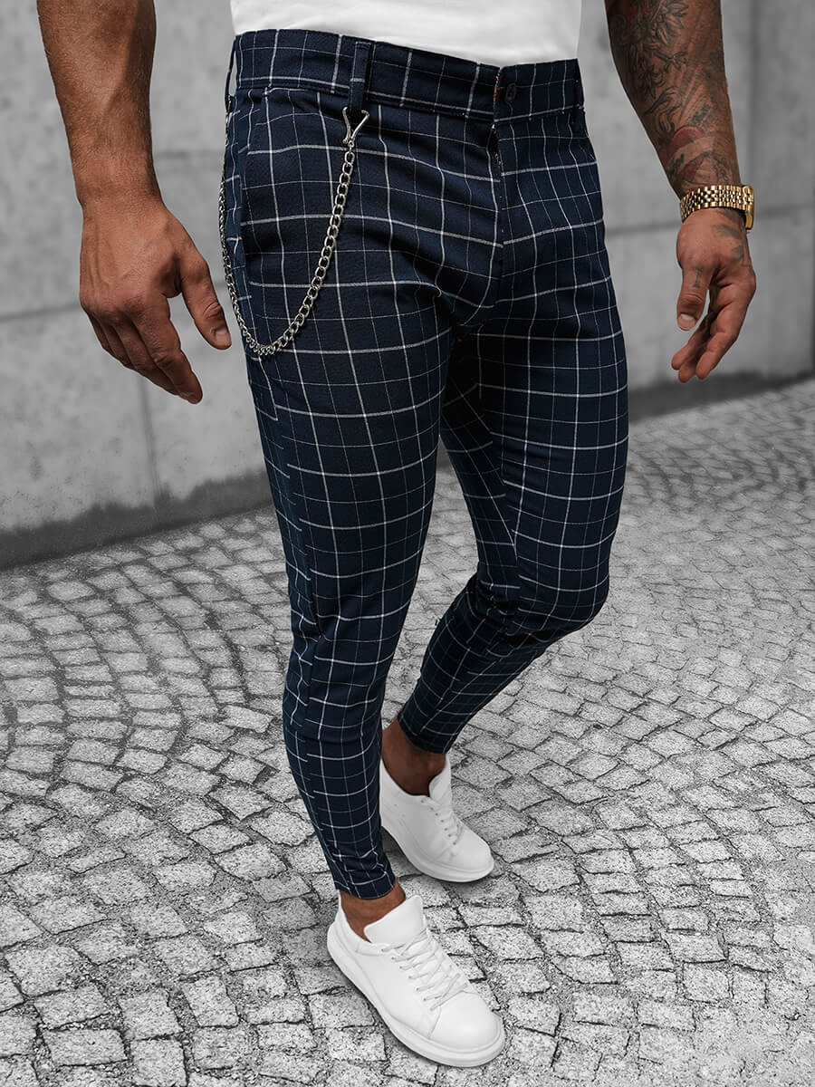Wir präsentieren Ihnen die außergewöhnliche Herren-Chinohose von Ozonee, Modell DJ/550171 aus der aktuellen Kollektion. Diese Hose besticht durch ihr trendiges Karomuster, die Reißverschlüsse an den Beinen und die abnehmbare Zierkette. Sie ist ideal für eine Vielzahl von Anlässen - vom informellen Treffen mit Freunden über den lässigen Stadtbummel bis hin zur eleganten Party.