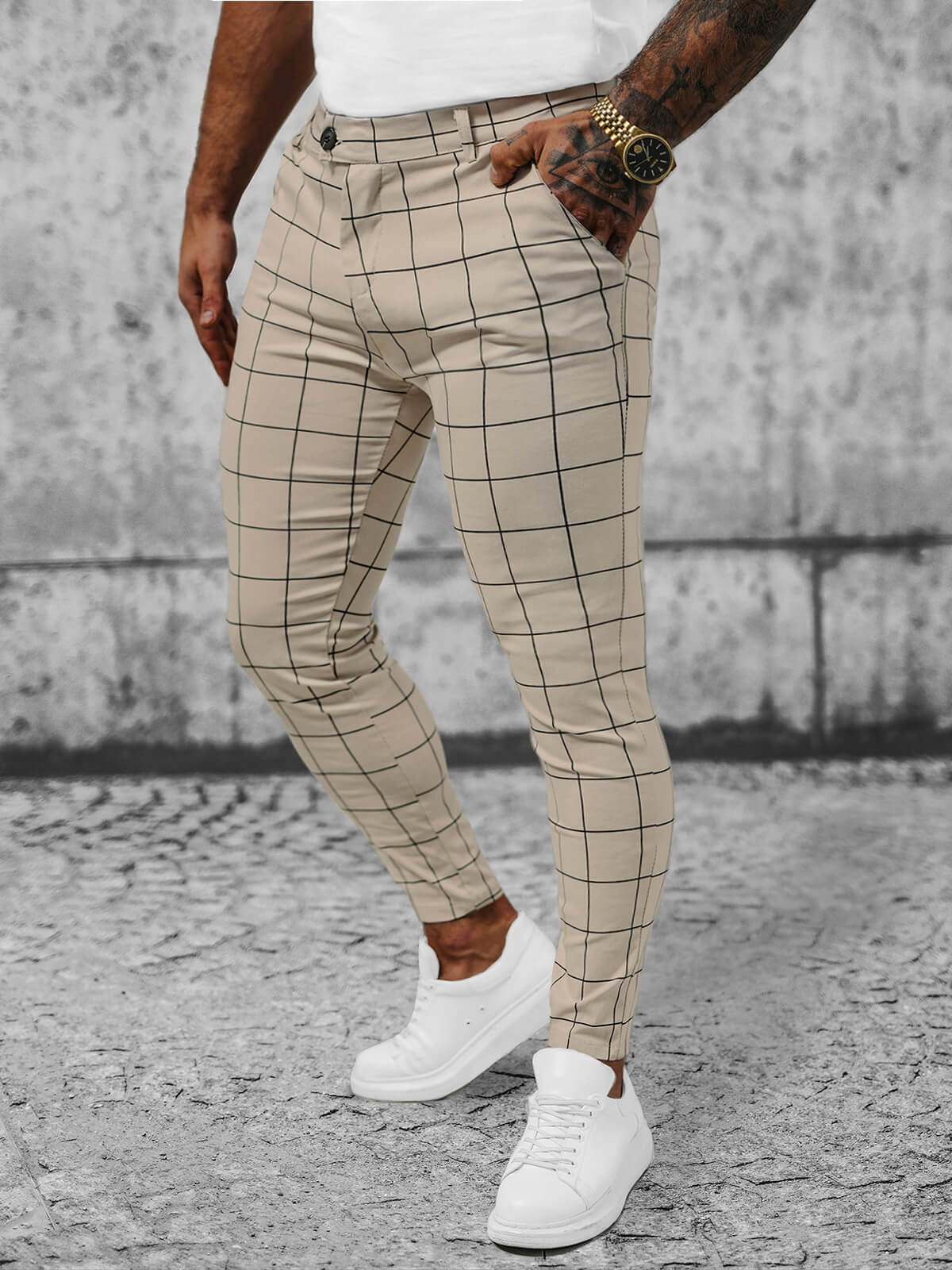 Die Hose hat einen Slim Fit, d.h. schmale Beine. Sie sind mit einem vielseitigen, zeitlosen Karomuster versehen. Auf der Vorder- und Rückseite befinden sich praktische Taschen für wichtige Dinge wie Schlüssel, Handy oder Geldbeutel. Die Hose besteht aus einer Kombination aus Viskose, Nylon und Elastan, sodass sie gut sitzt, nicht knittert und schnell trocknet.