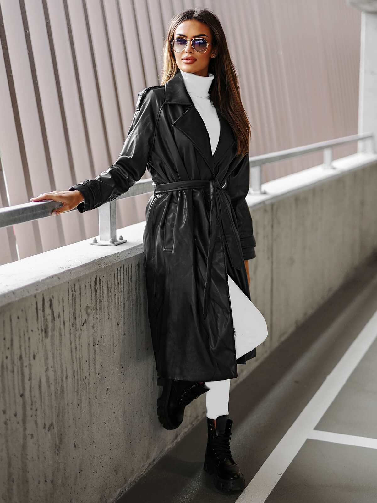 Wir präsentieren Ihnen einen raffinierten Damen Ledermantel in Schwarz, der die neueste Ergänzung unserer Kollektion ist. Dieser aus Kunstleder gefertigte und mit Knöpfen geschlossene Mantel vereint Eleganz und Zweckmäßigkeit. Ein zusätzlicher Vorteil sind Taschen an den Seiten und Epauletten an den Schultern, die ihm einen einzigartigen Charakter verleihen. Die Materialzusammensetzung besteht aus 100 % Polyurethan und das Futter aus 100 % Polyester. Das Model (174 cm) trägt Größe M.
