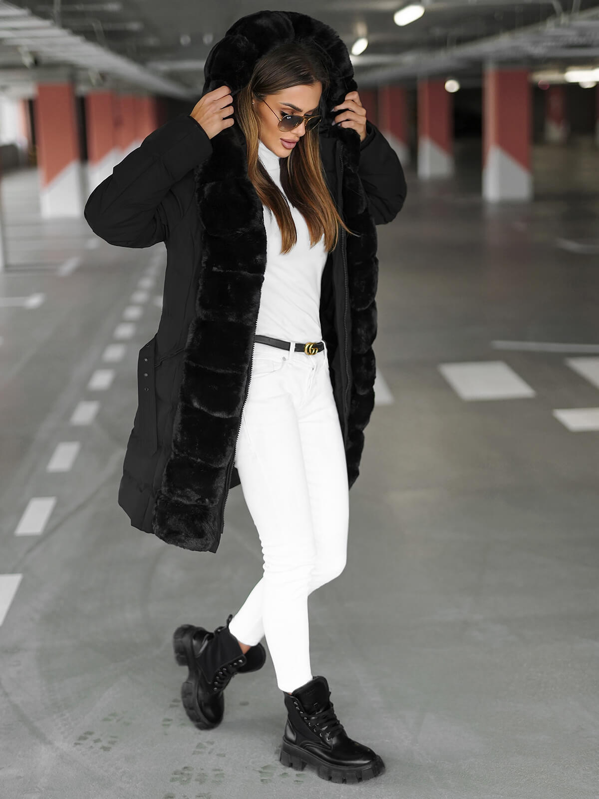 Das Design umfasst eine große Kapuze, abnehmbares Zierfell, modische Steppungen und seitliche Reißverschlusstaschen. Die Ärmel sind mit einem Saum versehen, der für eine perfekte Passform und Schutz vor Kälte sorgt.