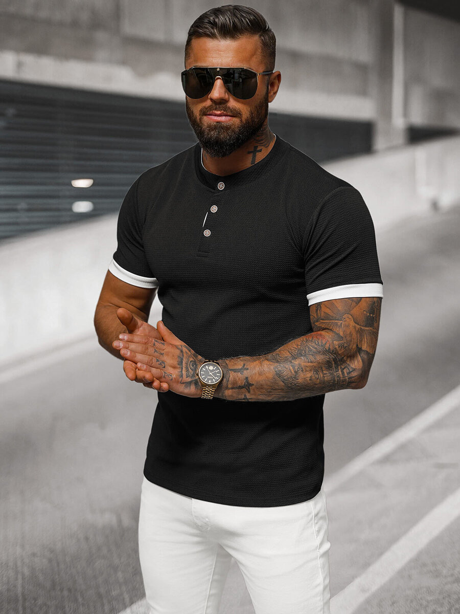 - Der Stehkragen mit drei Knöpfen verleiht dem T-Shirt einen eleganten Touch