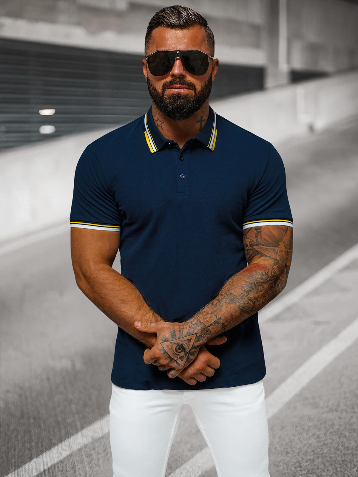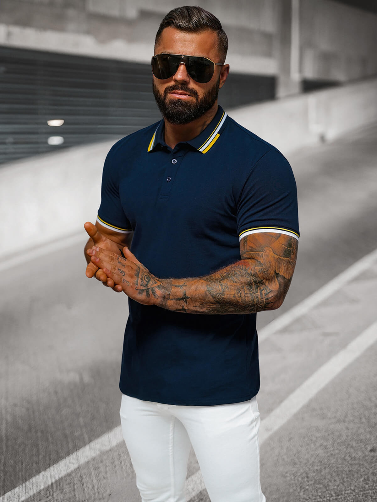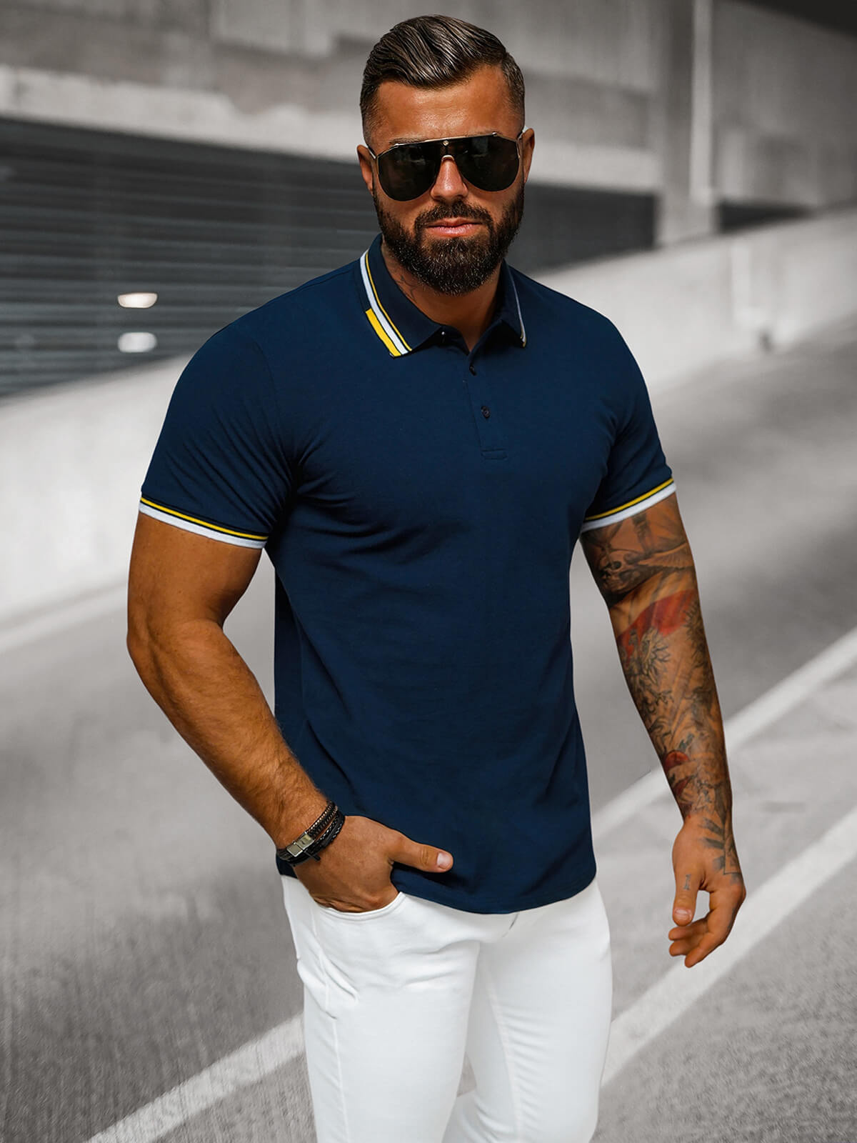 Das marineblaue Herren-Poloshirt OZONEE O/DA736 ist eine Neuheit aus der aktuellen Kollektion und verbindet Klassik und Komfort. Es ist aus hochwertigem Strickstoff gefertigt und garantiert eine perfekte Anpassung an die Silhouette. Es hat einen klassischen Kent-Kragen, der ihm einen eleganten Touch verleiht. Geknöpft und mit Rippenbündchen versehen, ist es nicht nur bequem, sondern auch funktionell.