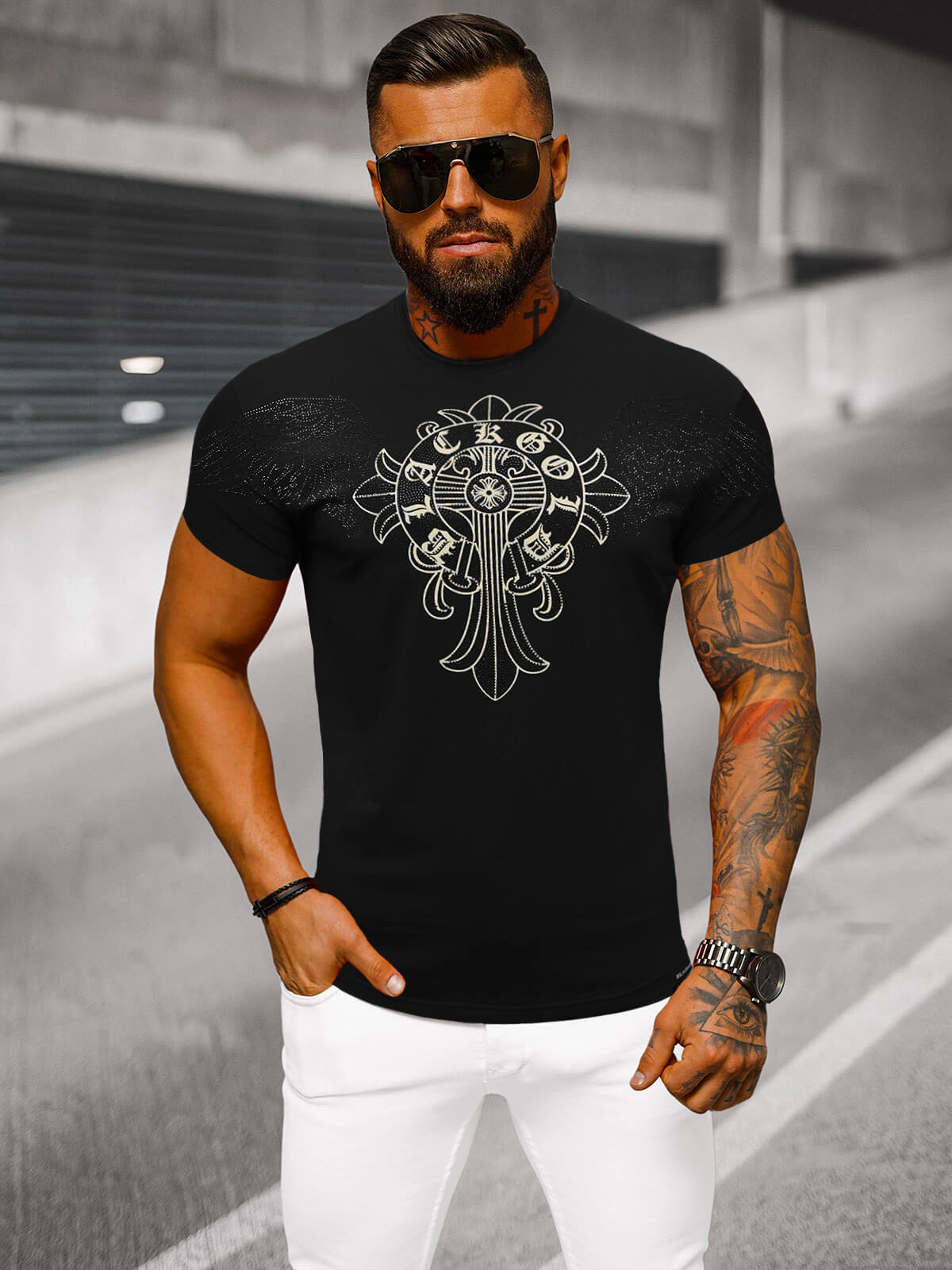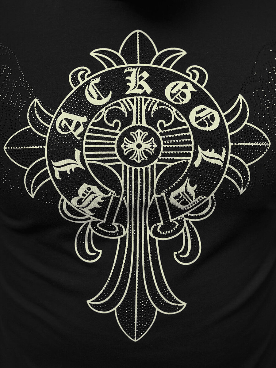 - Dieses modische T-Shirt aus Baumwoll-Elasthan-Mischung hat einen modischen Druck auf der Vorderseite und dekorative Strasssteine für einen einzigartigen Look