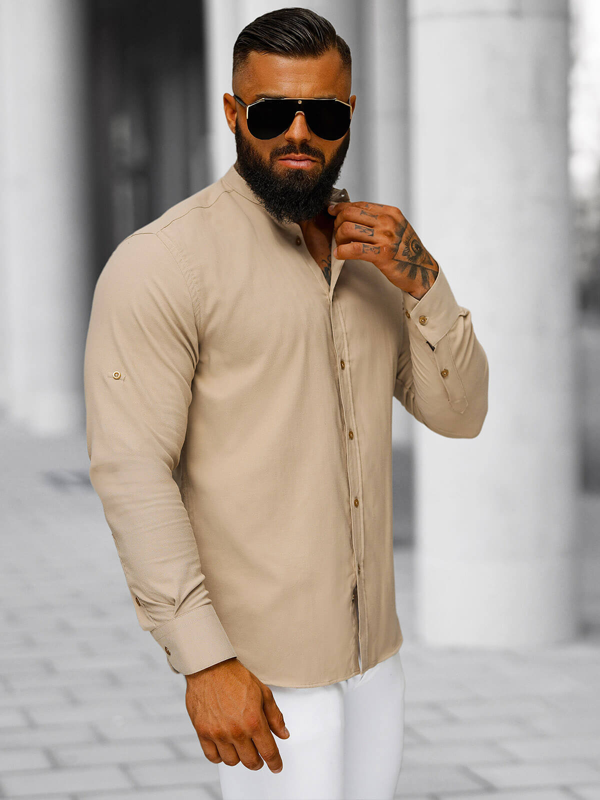 - Dieses klassische Hemd aus Baumwollmischung ist mit Knöpfen versehen und hat lange Ärmel sowie einen Stehkragen für einen eleganten Look