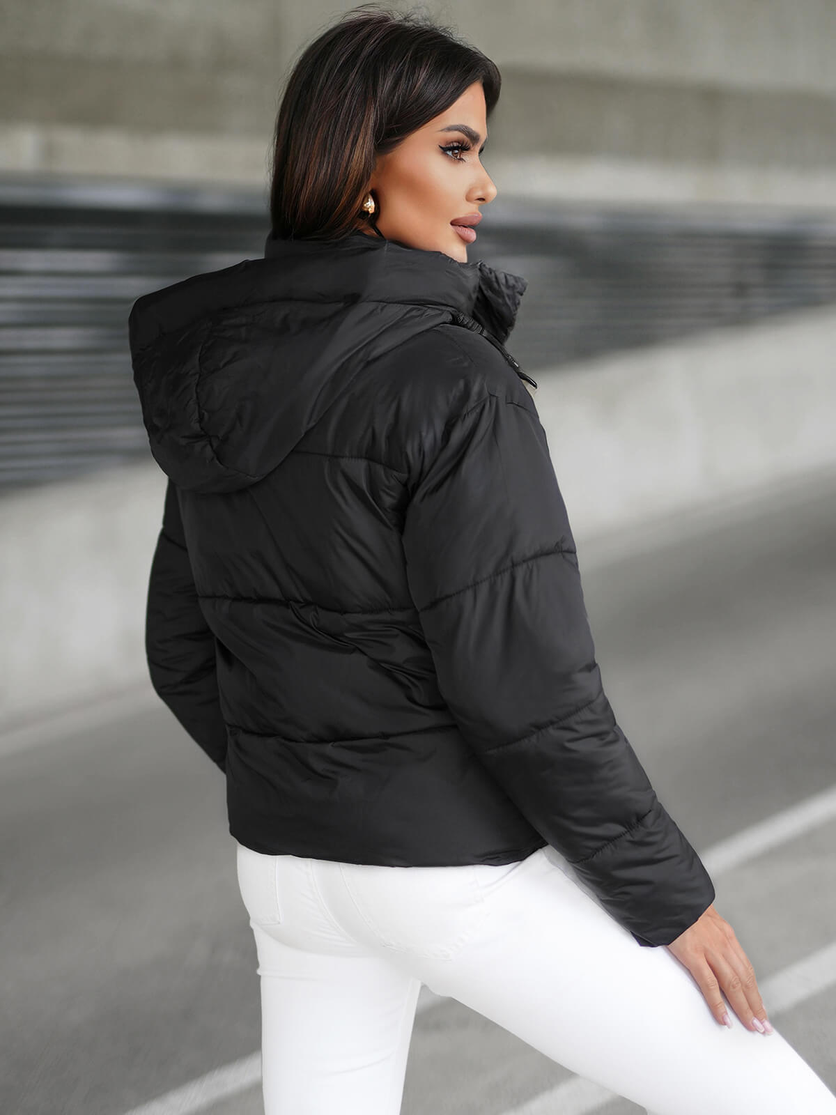 Die vorgestellte Damenjacke ist eine Kombination aus modernem Design und Funktionalität. Ihre elegante schwarze Farbe macht sie zu einem Kleidungsstück, das zu vielen Outfits passt. Die modische Steppung verleiht ihr einen einzigartigen Charakter, während die funktionelle Kapuze Schutz vor Kälte und Wind bietet. Die Jacke wurde für Frauen entworfen, die Wert auf Komfort und Stil legen.