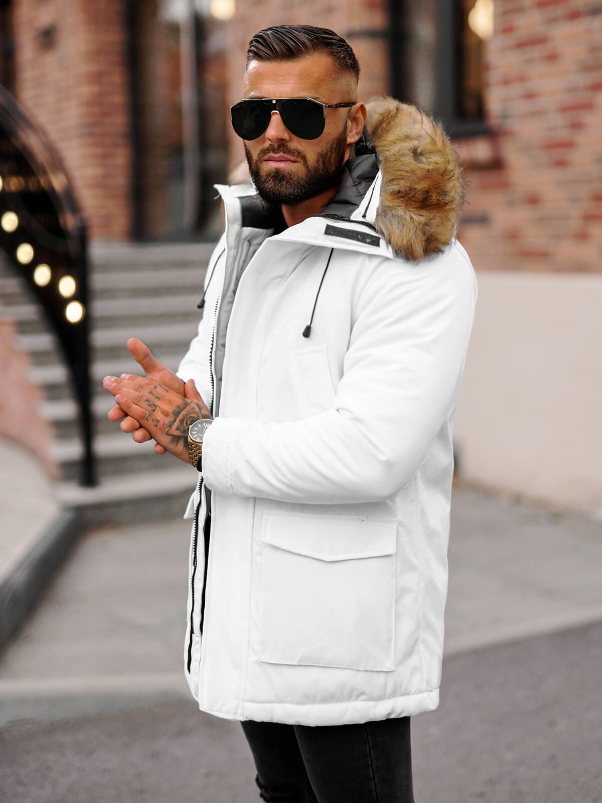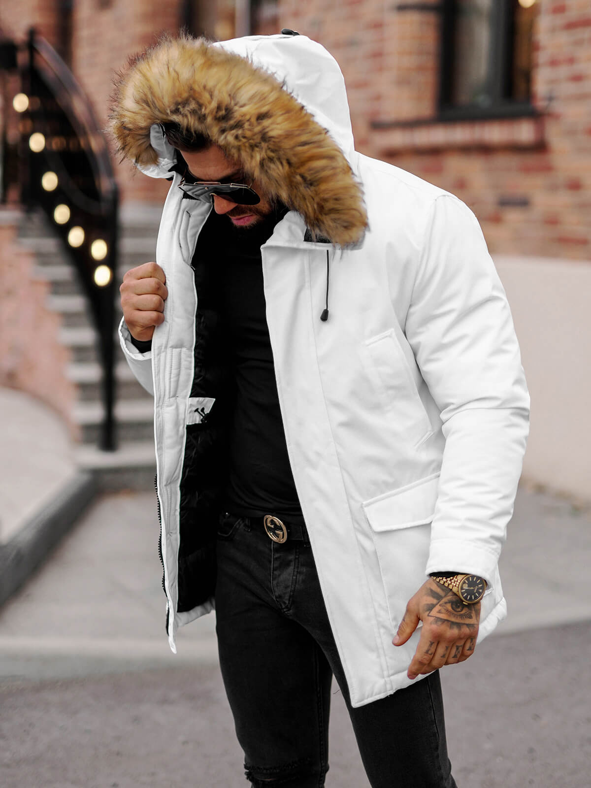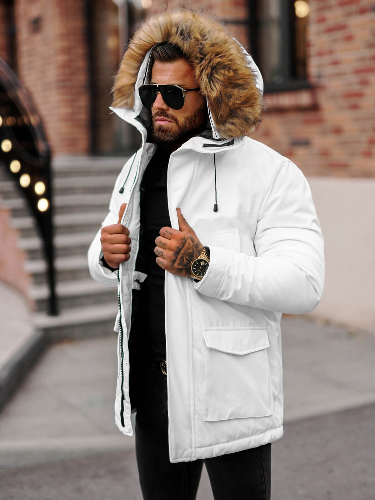 - Die abnehmbare Kunstfellkapuze und der hohe Kragen im Schornstein-Stil bieten zusätzlichen Schutz vor Kälte
