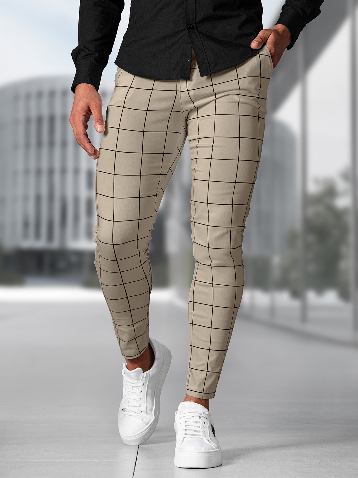Die Hose hat einen Slim Fit, d.h. schmale Beine. Sie sind mit einem vielseitigen, zeitlosen Karomuster versehen. Auf der Vorder- und Rückseite befinden sich praktische Taschen für wichtige Dinge wie Schlüssel, Handy oder Geldbeutel. Die Hose besteht aus einer Kombination aus Viskose, Nylon und Elastan, sodass sie gut sitzt, nicht knittert und schnell trocknet.