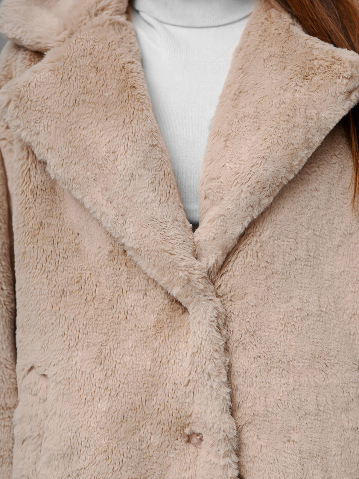 - Die Jacke besteht aus einem Material, das Fell imitiert, und bietet ein stilvolles und warmes Tragegefühl