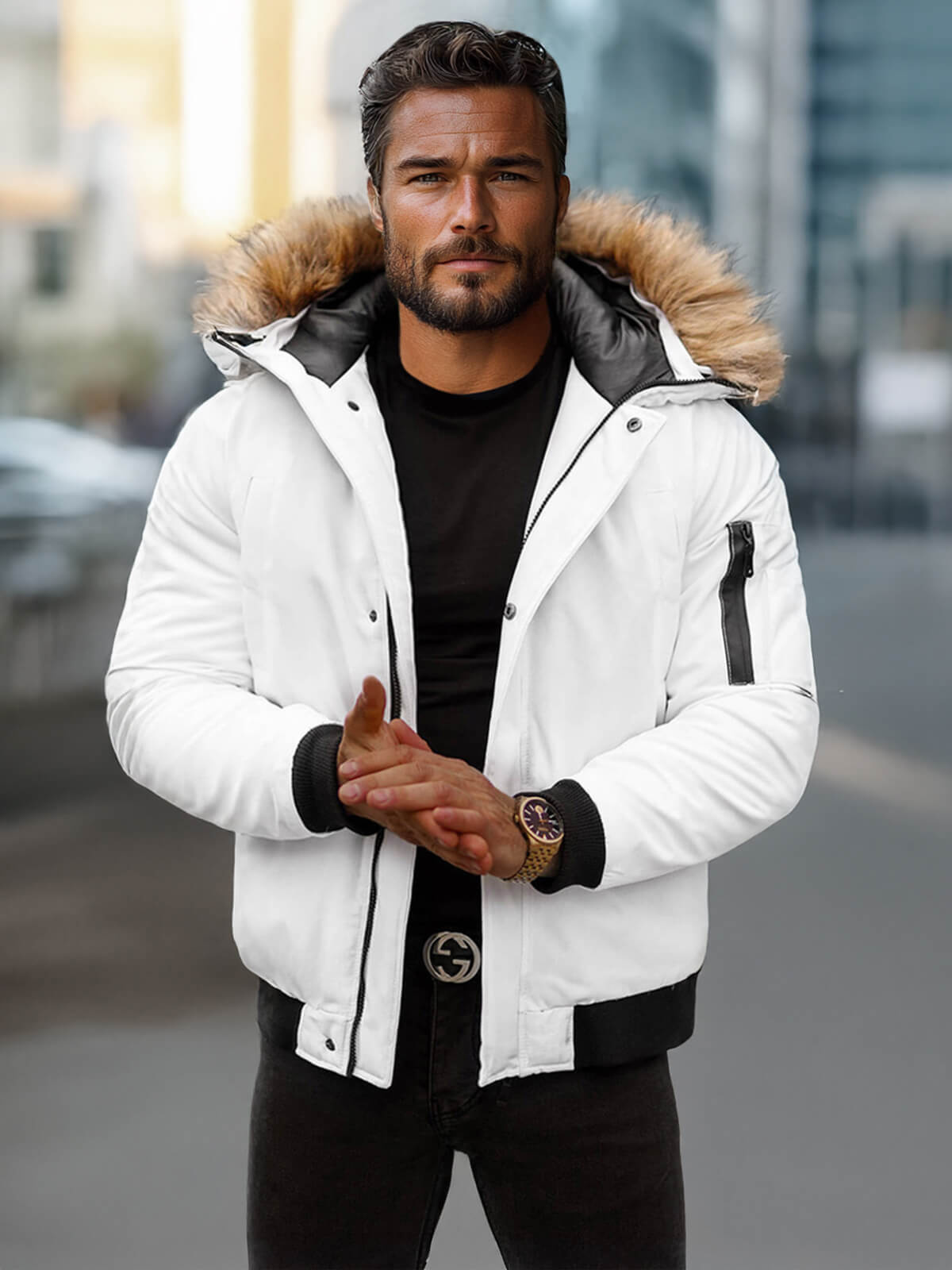 - Die abnehmbare Fellkapuze bietet zusätzlichen Schutz vor Kälte und kann je nach Bedarf abgenommen werden