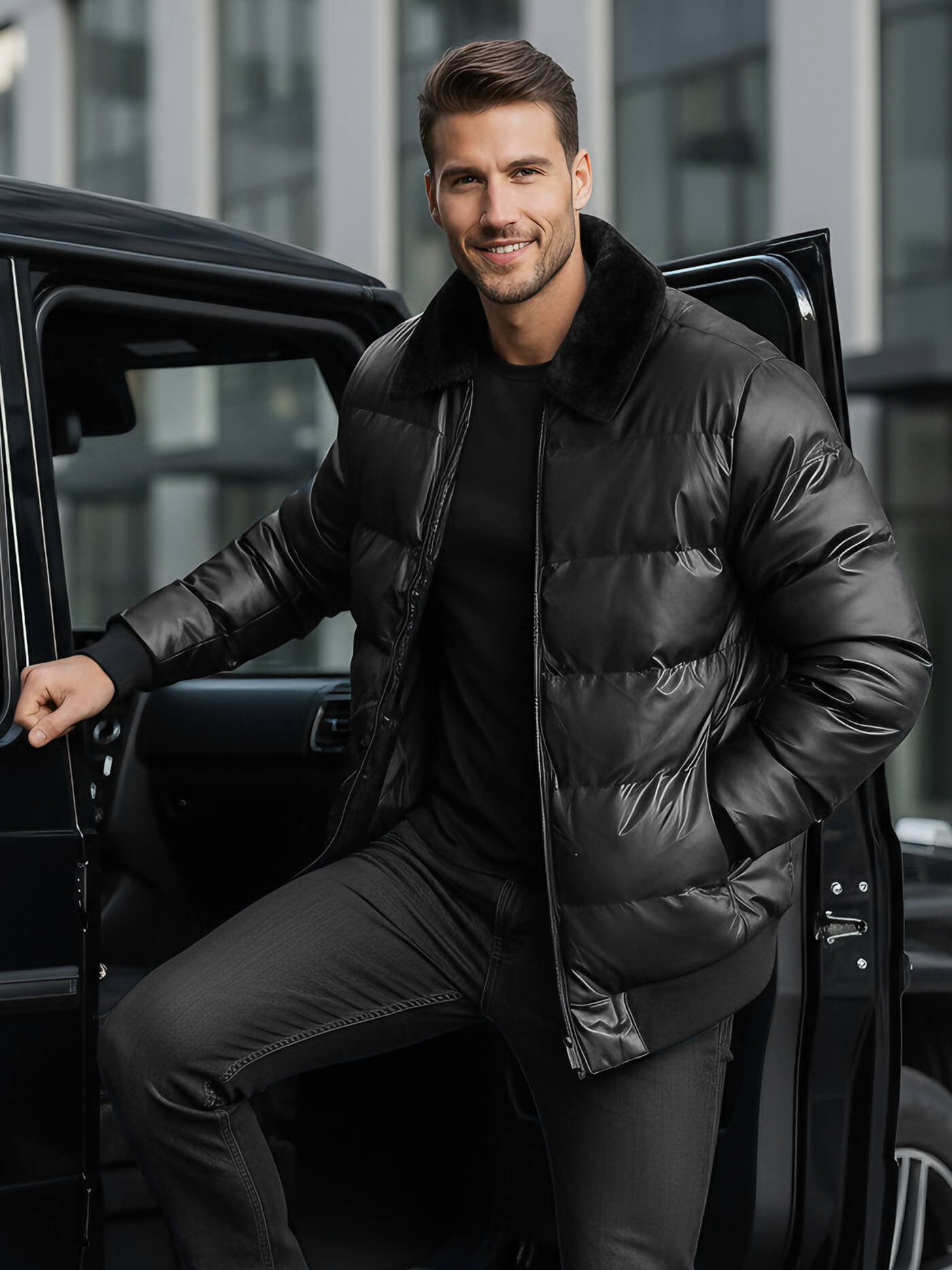 - Die Jacke ist aus einem Material gefertigt, das Leder imitiert, und hat einen weichen Fellkragen für zusätzlichen Komfort und Stil