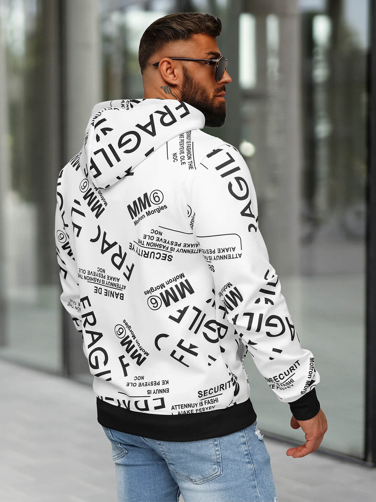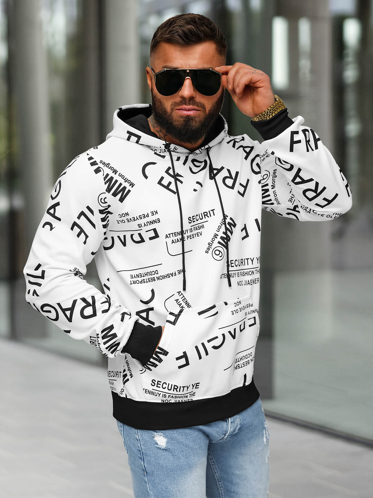 - Dieser Kapuzenpullover aus der neuesten Kollektion wird über den Kopf gezogen und ist mit einem modischen Druck versehen