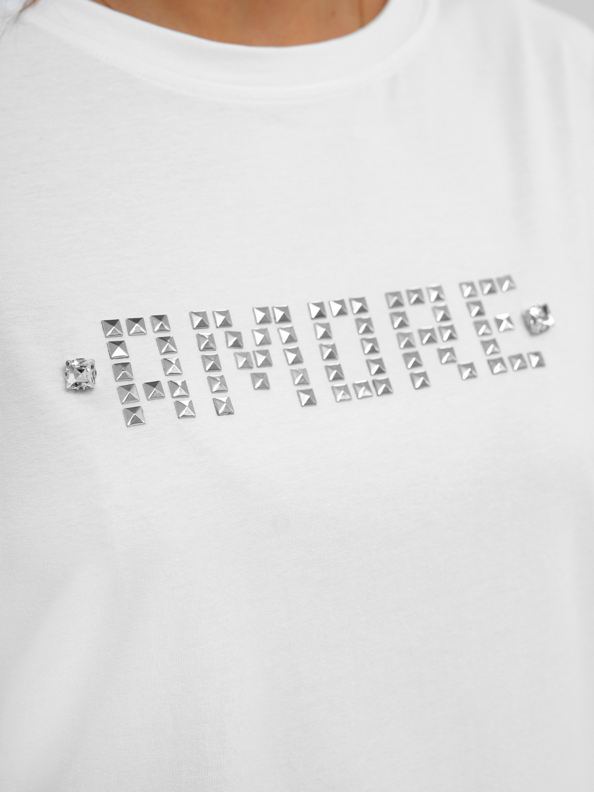 - Dieses klassische T-Shirt aus Baumwollmischung hat einen Rundhalsausschnitt und ist mit dekorativen Strasssteinen und Nieten versehen