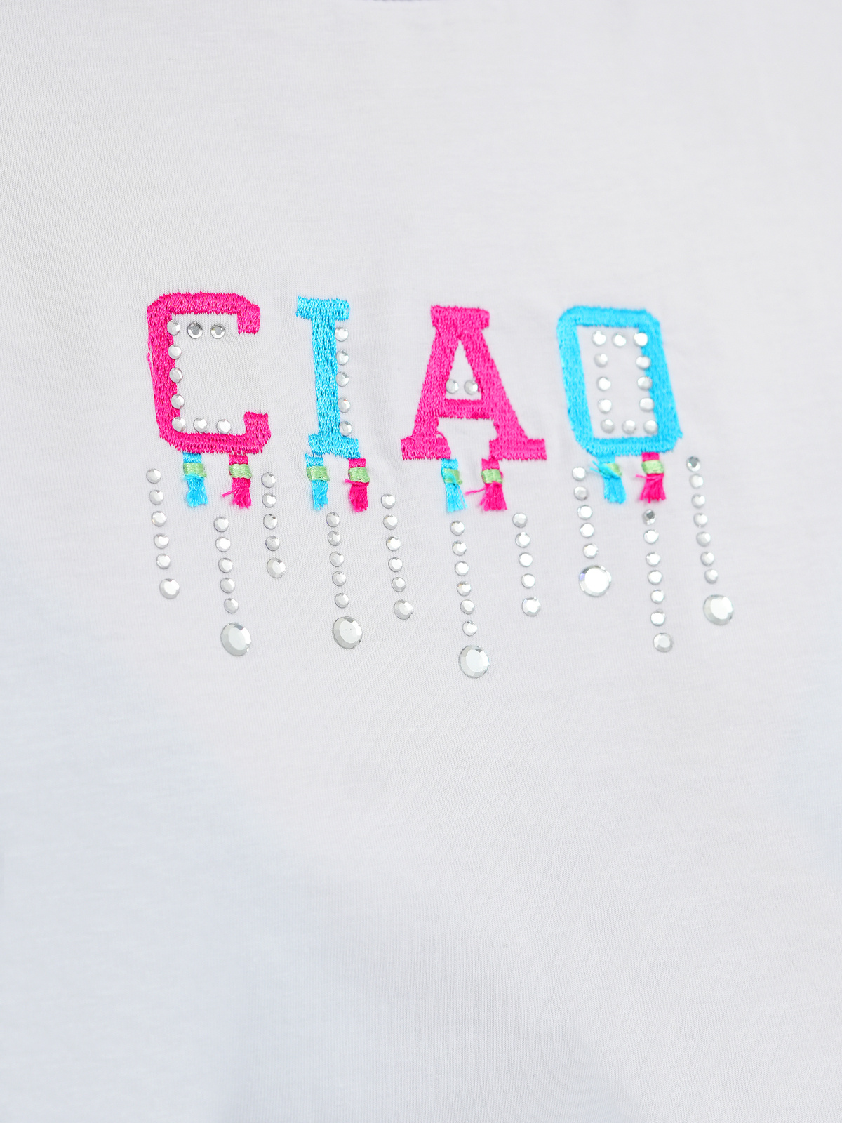 - Dieses klassische T-Shirt aus Baumwoll-Elastan-Mischung hat einen Rundhalsausschnitt und kurze Ärmel, verziert mit einem gestickten Schriftzug und dekorativen Strasssteinen