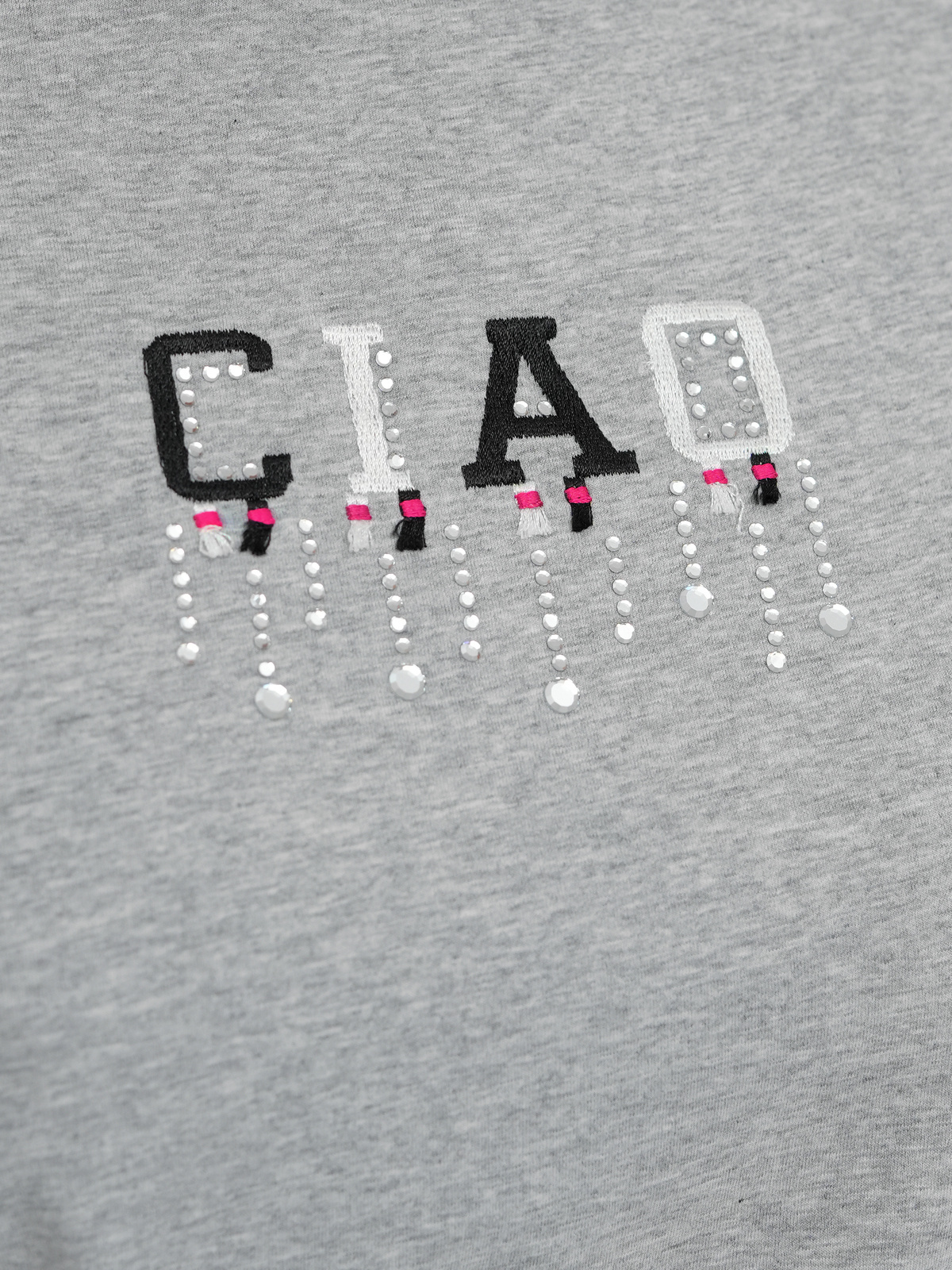 - Dieses klassische T-Shirt aus Baumwollmischung hat einen Rundhalsausschnitt und ist mit einem gestickten Schriftzug sowie dekorativen Zirkonien verziert
