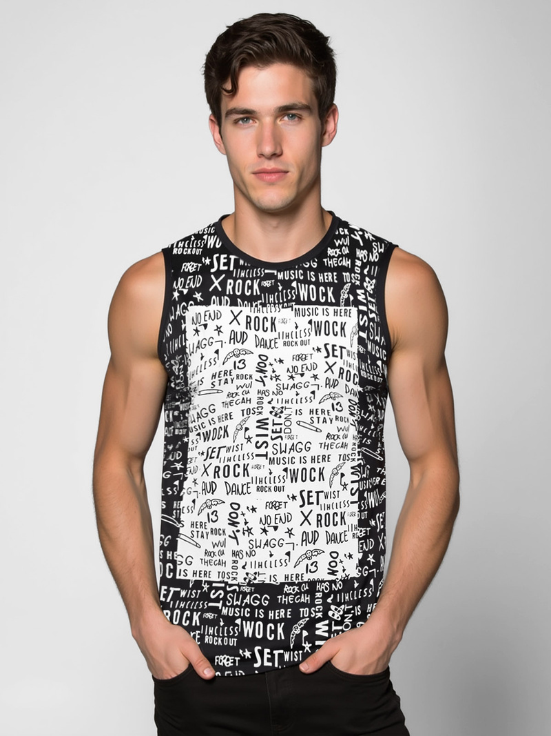Das T-Shirt hat einen Tanktop-Schnitt, d.h. ärmellos. Es stammt aus der neuesten Kollektion unseres Online-Shops. Die gesamte Vorderseite des T-Shirts ist mit einem originellen Aufdruck verziert, der eine Vielzahl von kleinen Schriftzügen zeigt. Das Tanktop ist aus einer Kombination von Baumwolle und Polyester hergestellt. Dank dieser Zusammensetzung ist es sehr bequem zu tragen, fühlt sich angenehm an, liegt gut am Körper an, knittert nicht und ist maschinenwaschbar.