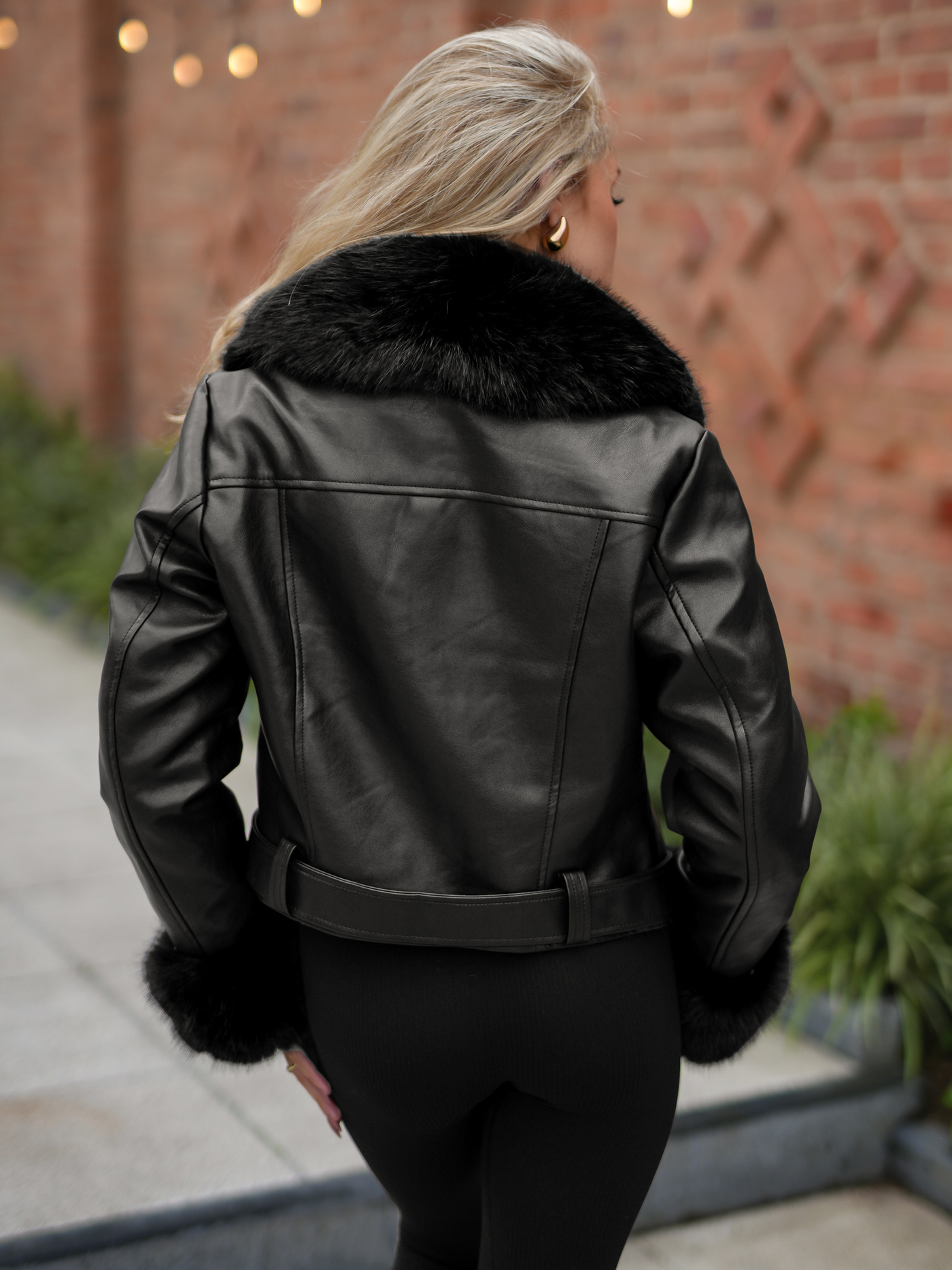 - Diese klassische Bikerjacke aus Material, das Leder imitiert, hat einen abnehmbaren Kunstfellkragen und seitliche Reißverschlusstaschen