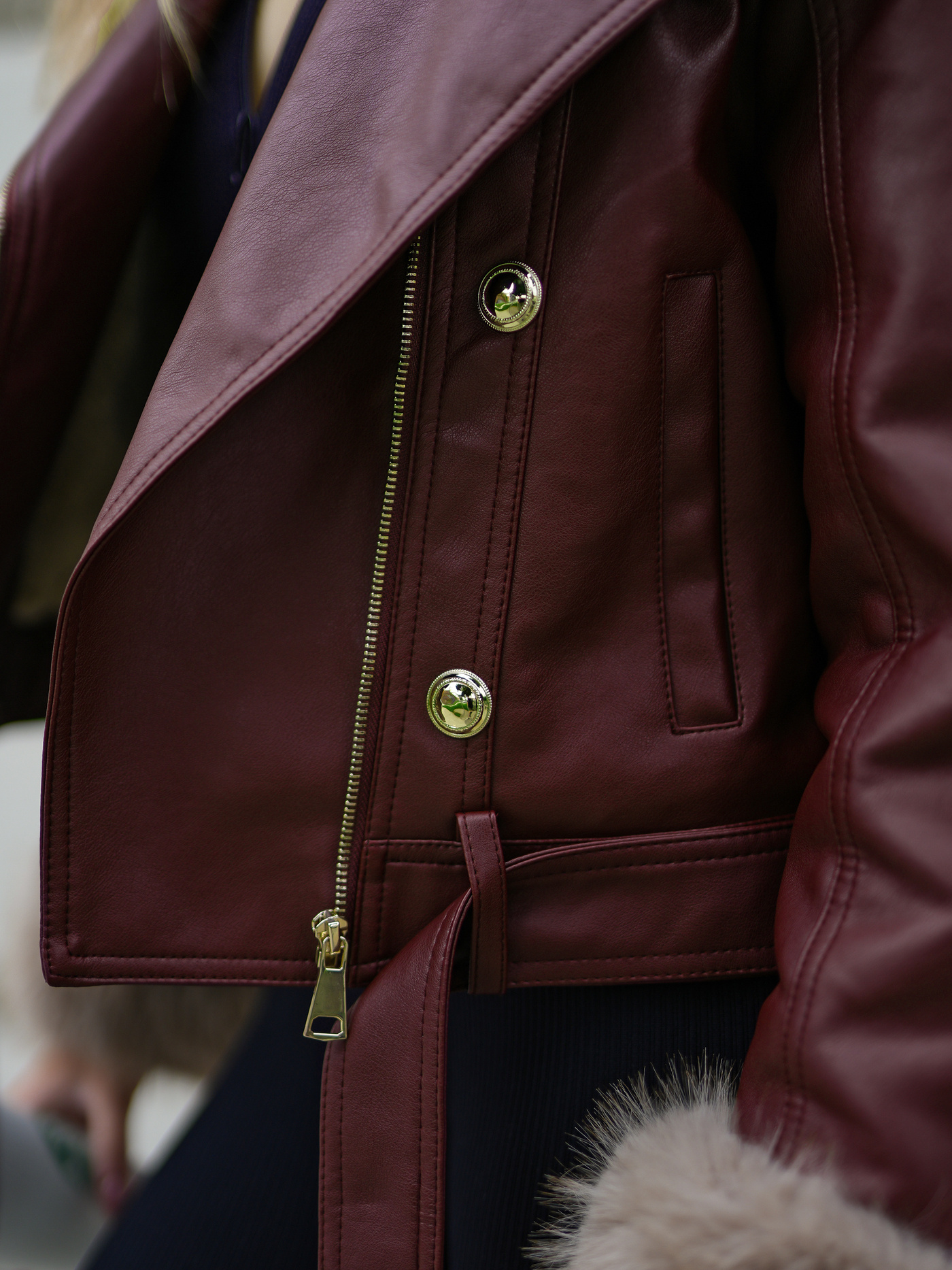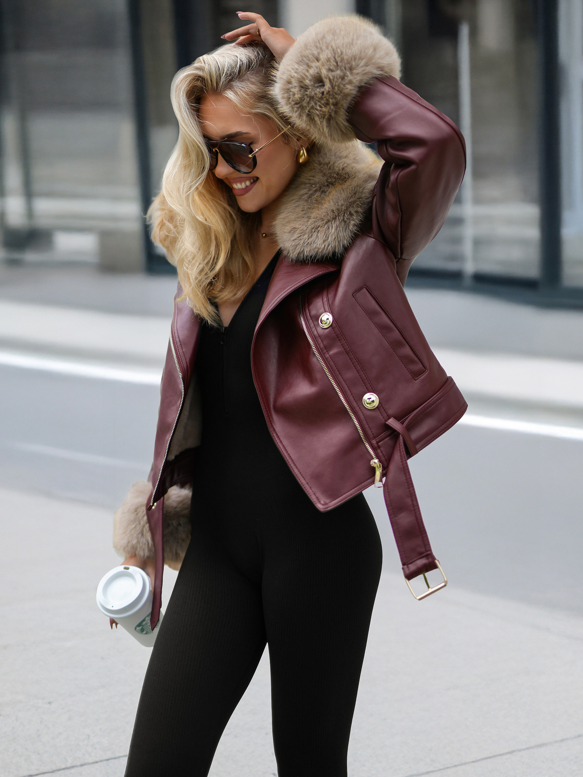 - Diese klassische Bikerjacke aus Material, das Leder imitiert, hat einen abnehmbaren Kunstfellkragen und seitliche Taschen für eine perfekte Kombination aus Stil und Funktionalität