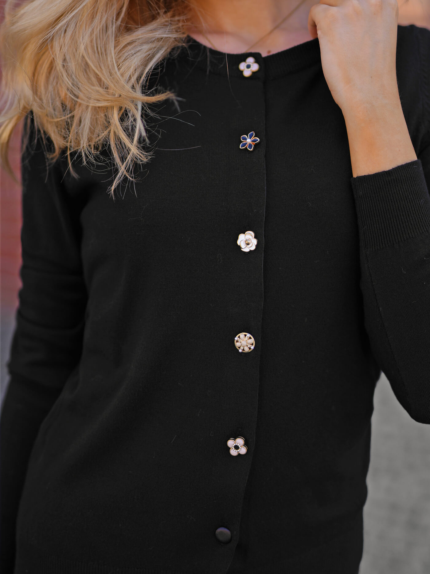 - Diese klassische Strickjacke aus weichem Material hat einen Rundhalsausschnitt und dekorative Knöpfe für eine elegante Optik