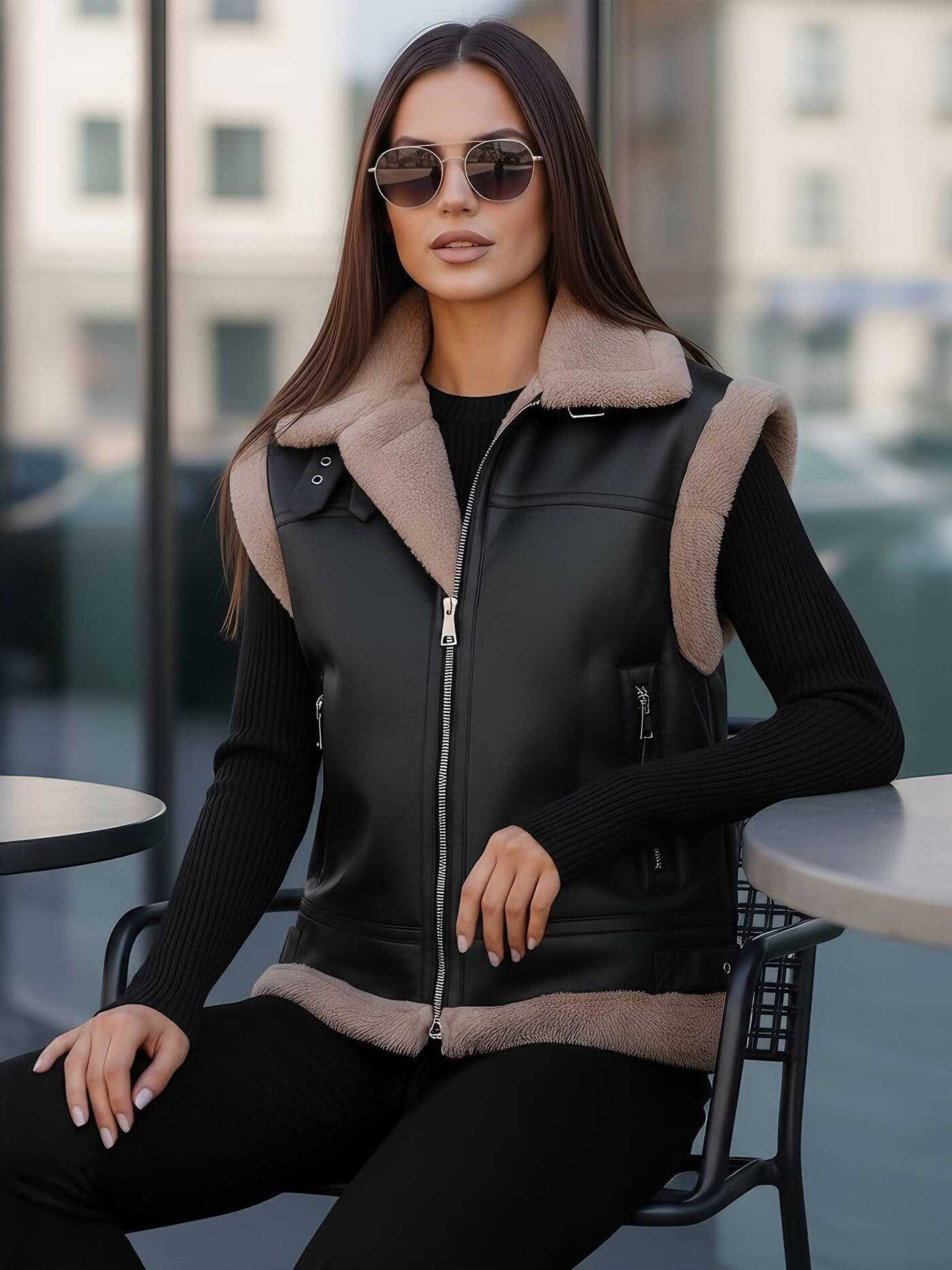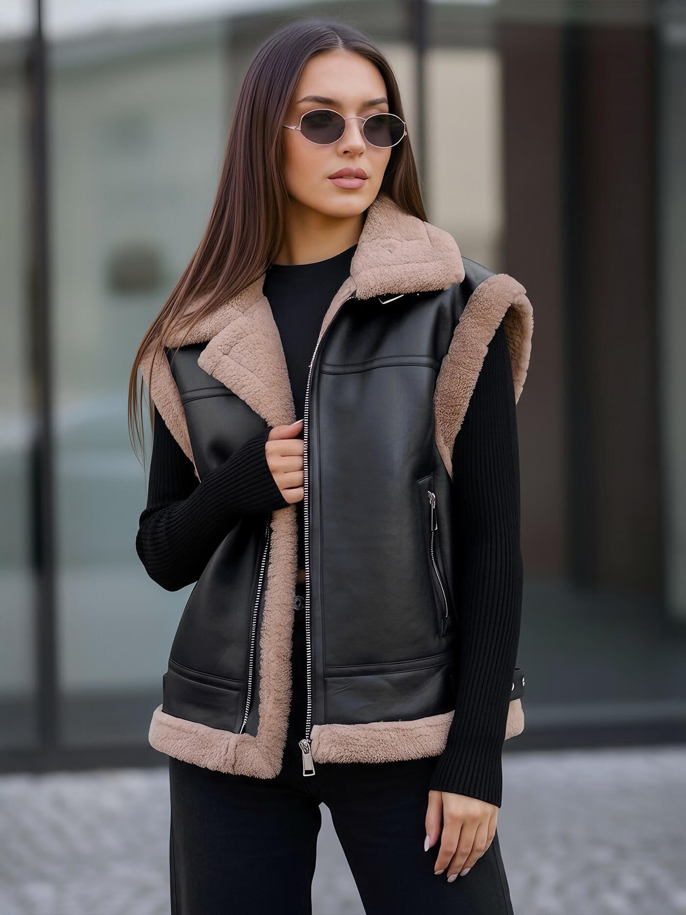 - Diese klassische Weste aus Material, das Leder imitiert, hat eine Länge bis zur Hüfte und ist mit einem Reißverschluss versehen, mit seitlichen Taschen mit Reißverschluss