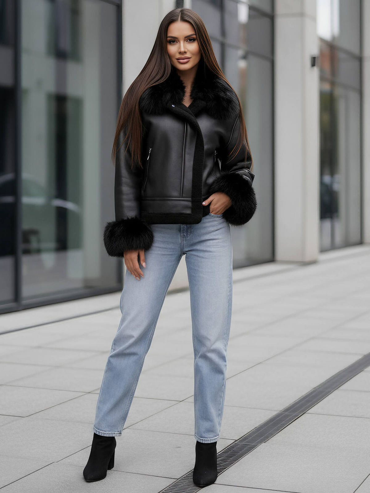 - Diese klassische Winterjacke aus Material, das Leder imitiert, hat einen Reißverschluss und einen Kragen sowie Ärmel mit Kunstfell für ein stilvolles Aussehen