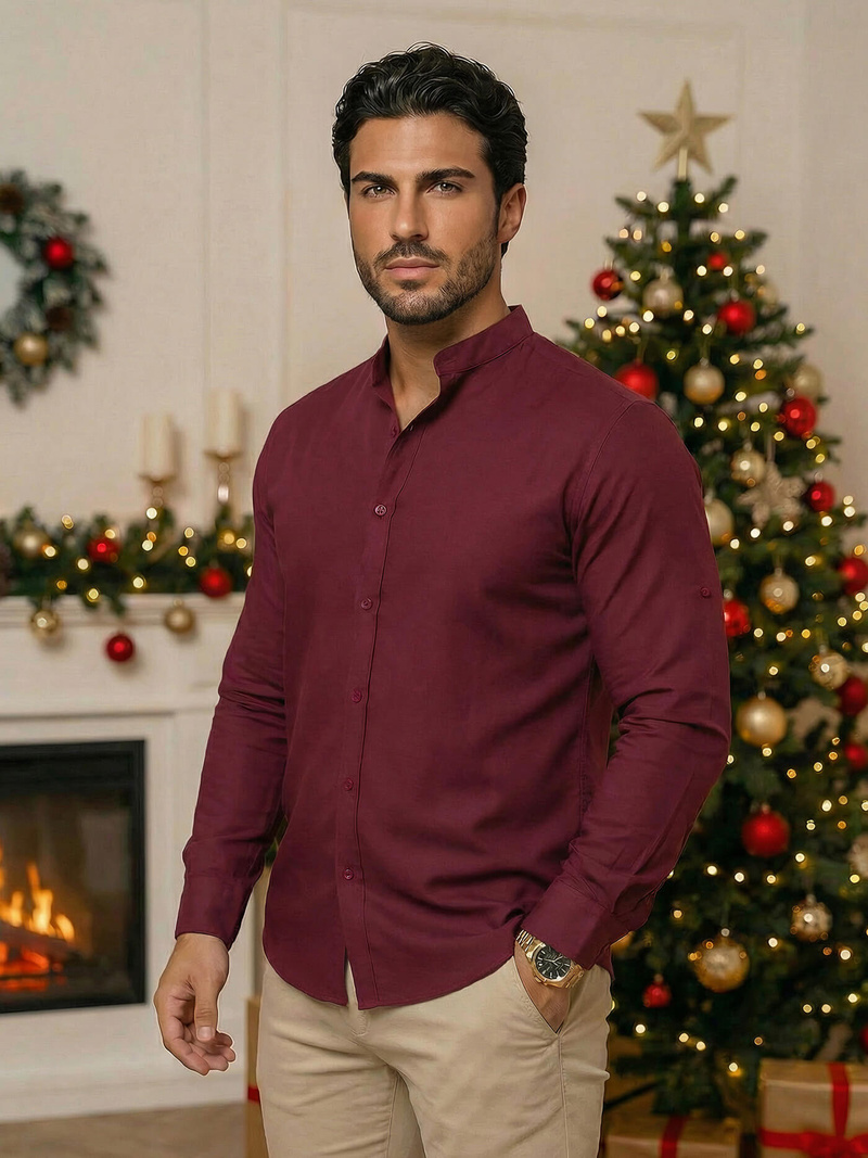 - Dieses klassische Hemd aus Baumwollmischung hat einen Stehkragen und ist mit Knöpfen versehen