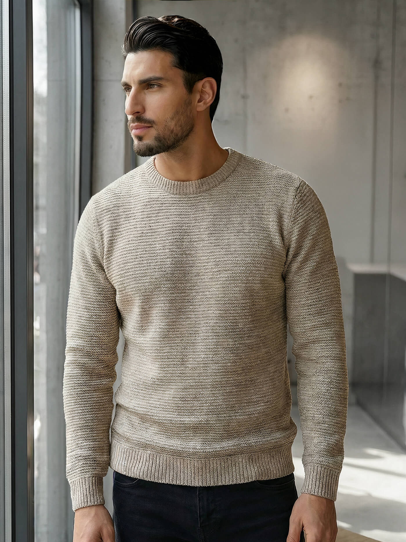 Perfekt für einen zeitlosen und bequemen Alltagslook – dieser klassische Herrenpullover in Beige überzeugt durch schlichte Eleganz und hohen Tragekomfort.