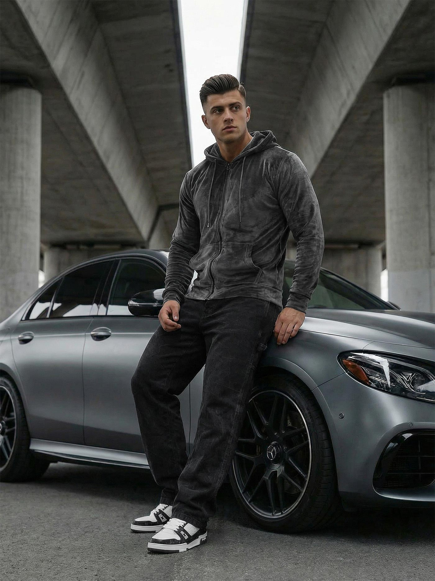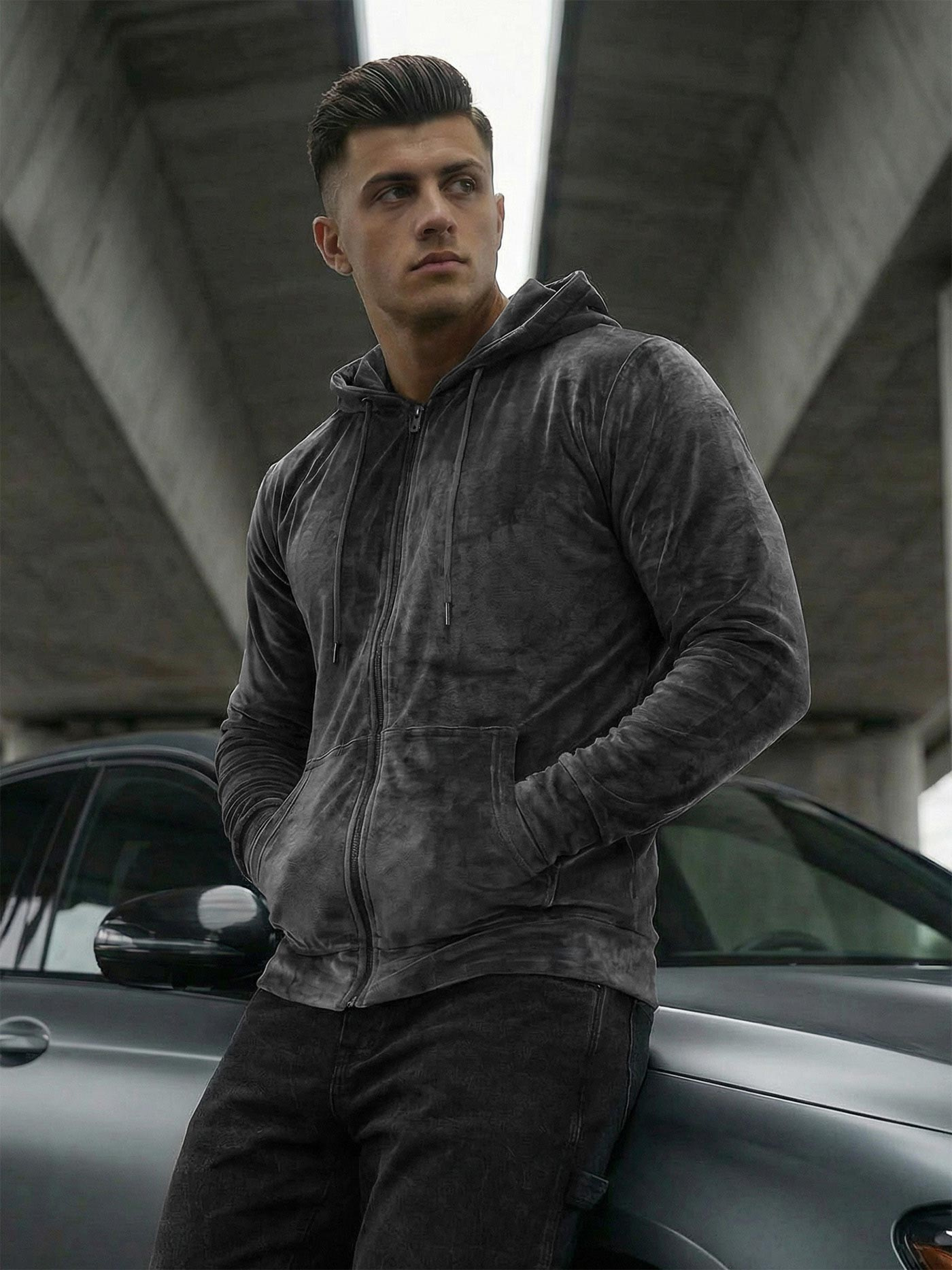 Herren-Kapuzenpullover aus graphitfarbenem Veloursleder OZONEE JS/8B1168/6Z - perfekt für jede Gelegenheit